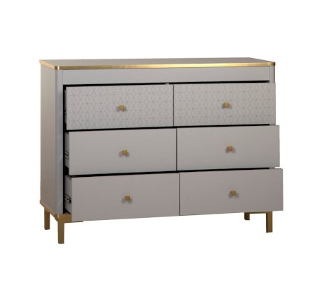 Корпус и фасады комода изготавливается в ЛДСП цвета Серый. Кромка, ручки и опоры золотого цвета. В сочетании с золотом серые тона выглядят не скучно, а золото приобретает благородный оттенок, что в итоге дает изысканное и утонченное сочетание.
