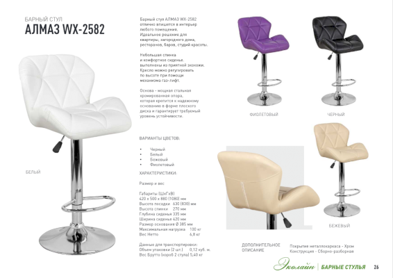 Популярный барный стул АЛМАЗ WX-2582 со спинкой непременно придется вам по вкусу и создает в кафе неповторимую атмосферу. Основа барного стула АЛМАЗ WX-2582 - мощная стальная хромированная опора, которая крепится к надежному основанию в форме плоского диска и гарантирует требуемый уровень устойчивости. Мягкие формы сидения и стеганой спинки обеспечат посетителю комфорт.
