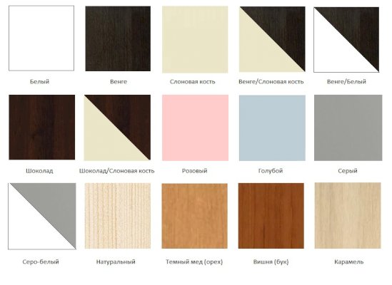 Возможные цвета кровати: белый, слоновая кость, венге, венге/слоновая кость, венге/белый, шоколад, шоколад/слоновая кость, розовый, голубой, серый, серо-белый, натуральный, темный мед (орех), вишня (бук), карамель