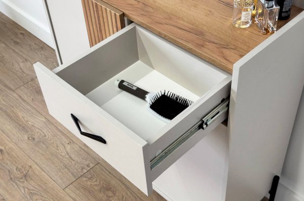С другой стороны комод оборудован выкатным ящиком, который обеспечивает легкий доступ к часто используемым предметам. Под ним расположен большой глухой фасад, скрывающий за собой просторное хранилище для более крупных вещей.