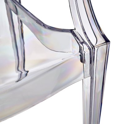 Стул изготовленный из литого полупрозрачного поликарбоната в сочетании с классическими формами спинки и подлокотников - это пример успешного сочетания классических форм и современной индустрии производства.
