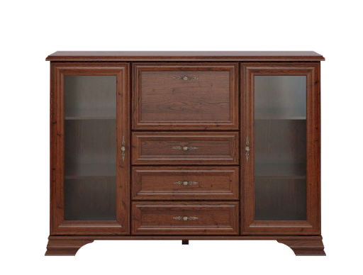 По бокам – два застекленных отделения с прозрачными дверцами и стеклянными полками внутри.