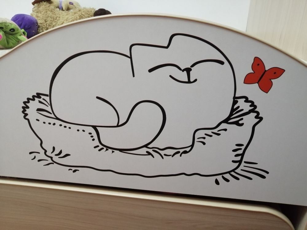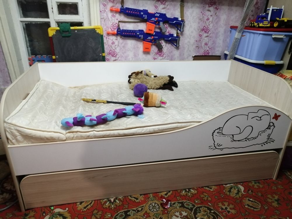 В общем кровать понравилась. Радует что второе место не очень высоко как в двухьярусных кроватях. Т к тогда дети ссорились бы кто спит на верху. Экономит место т к на день задвигается нижнее спальное место. Милый котик радует глаз. Низ выкатывается на колесиках. Сборка по инструкции не заняла много времени.все края везде окантованы. Доставка вовремя, спасибо продавцу.