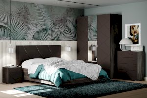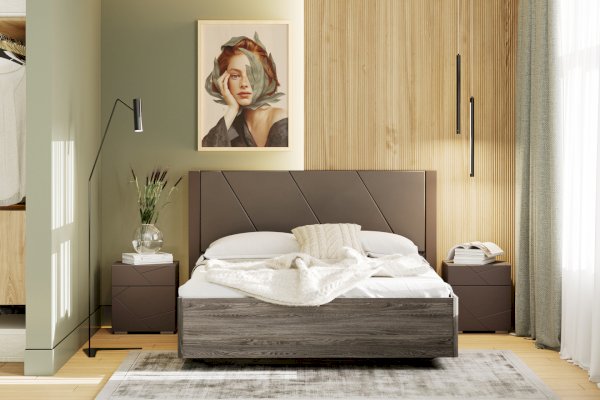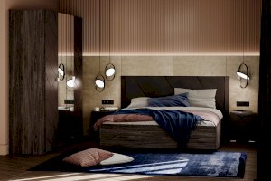 Все ручки в мебели — скрытые. Элементы изголовья кровати обтянуты мягким кожзамом, а оригинальное основание с эффектом «парения» преображает интерьер. В выдвижных ящиках используется система скрытых направляющих Quadro stop control, что позволяет легко и почти бесшумно использовать ящики. Большие зеркала шкафа визуально расширяют пространство комнаты и сделают утренние и вечерние ритуалы еще приятнее.