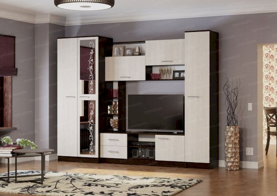 Универсальный дизайн и высокую функциональность объединила в себе гостиная «Флора». Она надежна и вместительна, рассчитана на долгие годы активной эксплуатации. Незамысловатое оформление гарнитура идеально гармонирует с современными интерьерами. Индивидуальность и немного шарма придают изделию цветочный орнамент на зеркале и ассиметрично расположенные открытые полочки.