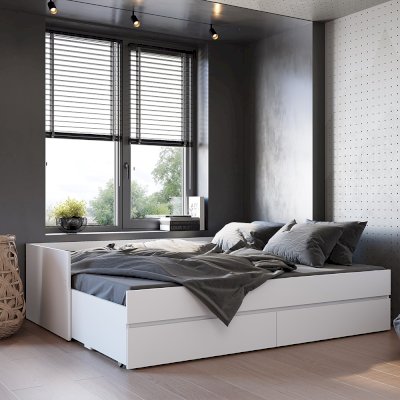 Кровать-трансформер из коллекции "Симпл" - это практичная и комфортная модель для современной спальни. Она удобна в использовании в небольших помещениях - при необходимости ее можно раздвинуть и получить дополнительное спальное место. Кровать оснащена выкатными ящиками, в которых легко размещается постельное белье, текстиль и другие вещи, которым не нашлось места в шкафу. Основание для кровати в комплекте - ламели для раздвижных кроватей. К данной модели кровати можно отдельно приобрести матрас-трансформер.