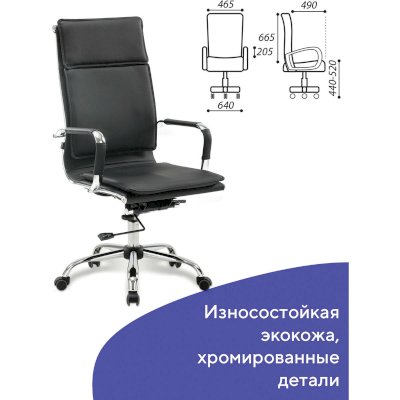 Конструкция кресла отвечает всем нормам современной эргономики: высокая спинка, упругая набивка и хромированные подлокотники с противоскользящими накладками. Всё это обеспечит необходимым комфортом пользователя.