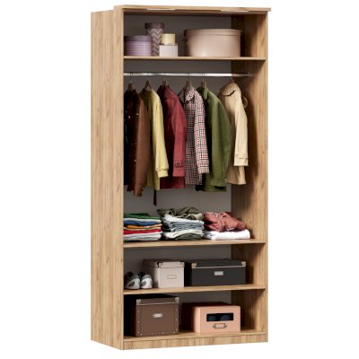 - За 2 распашными фасадами 3 полки и штанга для одежды. Высота ниши со штангой 1250 мм