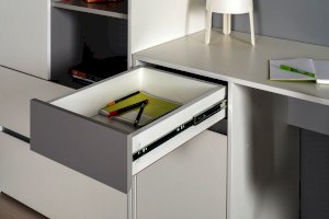 Отсутствие лицевой фурнитуры и открывание фасадов за край - это то не только интересное стилевое, но и эффективное функциональное решение. Так мебель занимает меньше места и можно проходить вплотную рядом с фасадом без риска зацепиться за ручку или травмироваться.