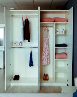 • В правой - две мини секции: с вешалом для длинных вещей и с 4 полками (две нижние и верхняя полки - съемные; третья снизу - жесткая), эти мини секции объединены общей верхней жесткой полкой.
