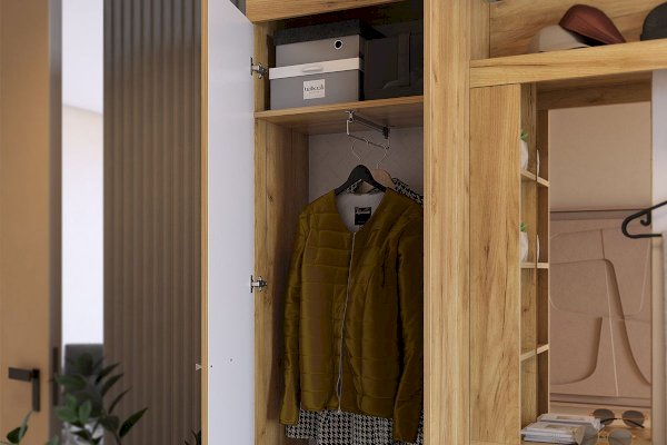 «Алекс» - прихожая 3 в 1. Это открытые ниши для размещения одежды, сумок на металлические крючки и модное решение из хромированных трубок для хранения повседневной обуви.  Закрытый шкаф-гардероб для несезонной обуви и верхней одежды на плечиках. А так же ниша-трюмо с зеркалом и полками сбоку станут незаменимыми помощниками в наведении  утреннего марафета. В закрытом шкафу под зеркалом можно хранить средства для чистки обуви, фен и другие нужные вещи. Прихожая «Алекс» - в ней поместится ВСЕ и даже Больше!