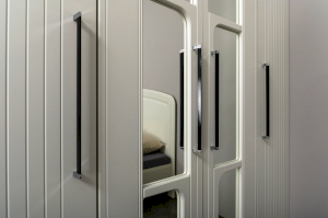 Вся лицевая фурнитура металлическая, графичное и стильное сочетание черного и хромированных деталей эффектно расставляет акценты на мебели.