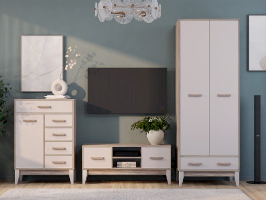 Двухстворчатый шкаф «Скандика» выполнен из качественной ЛДСП в оттенках дуб смоки/кашемир. Матовые фасады практичны в использовании. Модель состоит из нижнего выкатного ящика, двух распашных дверок, за которыми находится отделения с хромированной штангой, вместительная верхняя полка и встроенный блок с двумя дополнительными полками. Створки плотно фиксируются на магнитах.