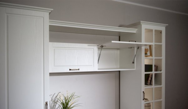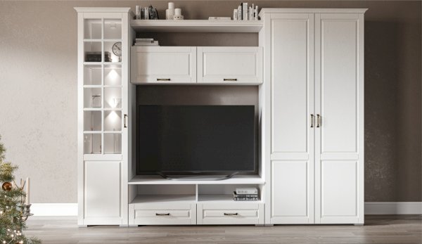Функциональная стенка Лацио создана для тех, кто ценит комфорт, уют и эргономику. Сочетание белоснежного цвета и стеклянных фасадов визуально расширяет пространство, добавляет света и лёгкости. Декоративными элементами стенки служат фрезерованные фасады из МДФ с текстурой дерева и фигурный карниз. В шкафу с прозрачными витринами будет идеально смотреться красивая посуда. Тумба для ТВ с открытыми и закрытыми полками разместит приставки, медиа устройства. Система Лацио состоит из множества отдельных модулей, благодаря чему можно легко подобрать мебель для комнаты любого размера и нужного вам функционала.