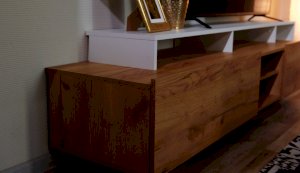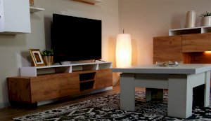 Стенка Невио-2 выполнена с использованием новейшего декора «Дуб крафт золотой» в сочетании с белым - подходит для стилистических направлений лофт, минимализм, скандинавский. Простые формы, естественные природные оттенки создают гармоничную и умиротворенную атмосферу гостиной. Четкая текстура дерева, белый цвет, отсутствие внешней фурнитуры, углубленный цоколь - создают визуальную легкость и компактность стенки. Фасады, выступающие на 1см поверх корпуса, заменяют ручки. Стенку дополняет вместительный комод с витриной. Мебель выполнена из высококачественных экологичных материалов.