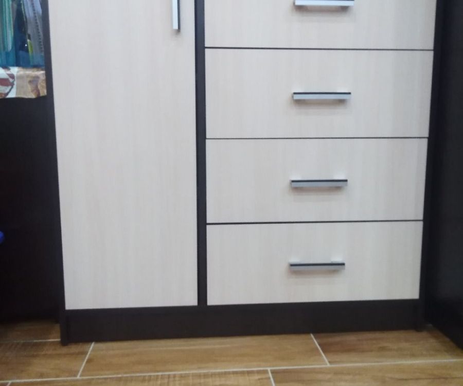 Фурнитура: ручки пластиковые, шариковые направляющие, 4 выкатных ящика, петли распашной двери без доводчиков.