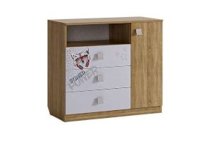 3 выкатных ящика, ниша и закрытые полки, все что нужно что бы разместить вещи вашего ребенка.  Эффектный принтерный рисунок на фасадах выдержан в общем стилистическом решении. Рисунок устойчив к истиранию и ультрафиолету. Открытая ниша для гаджетов, столешница толщиной 25 мм, на которой с легкостью поместиться большой телевизор.