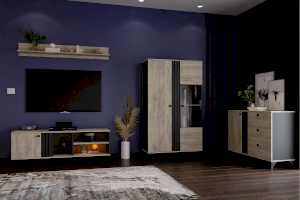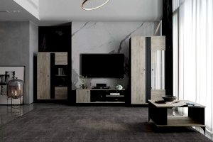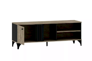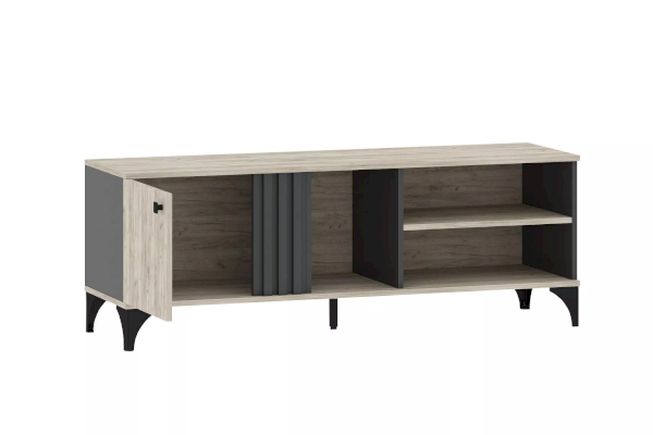 Тумба оснащена тремя открытыми нишами, в которых можно расположить аудио- и видеоаппаратуру, а также полкой за распашной дверкой с системой доводчиков, благодаря которым дверка закрывается плавно и бесшумно, а высокие опоры обеспечивают быстрый и легкий доступ во время уборки.