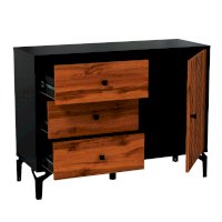 У комода три выдвижных ящика с шариковыми направляющими слева и отделение с распашной дверью на петлях без доводчиков справа. Внутри-полка, выполненная в цвет корпуса и выдерживает нагрузку до 5 кг.