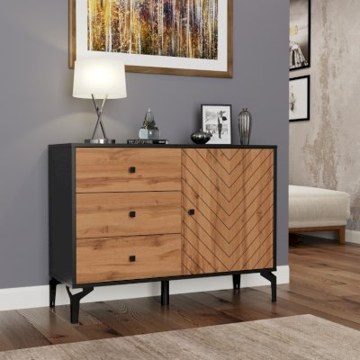 Контрастное сочетание декоров ЛДСП, применение УФ-печати на фасаде, металлические опоры замысловатого вида в цвет корпуса комода. Рисунок на фасаде нанесен при помощи технологии УФ-печати. Принты не выцветают со временем и устойчивы к механическому воздействию.