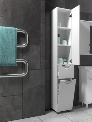 2 дверцы; 1 ящик; 2 полки ЛДСП; ручка металлическая хромированная; 1 бельевая корзина.