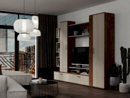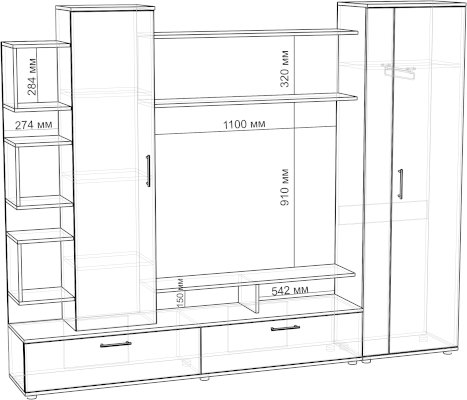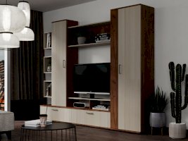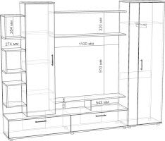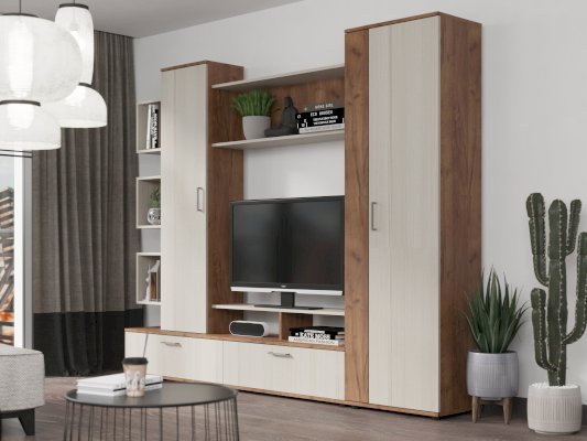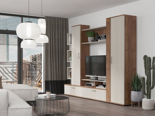 Гостиная «Дарина» украсит любой интерьер и сделает его современным и уютным. Стенка очень функциональна, включает в себя шкаф с выдвижной штангой, шкаф с полками и откидными дверцами, тумбу ТВ с 2 секциями с откидной дверцей и 2 нишами, секцию с открытыми полками. Удобная ниша под TV, а открытая полка под нишей позволит хранить различные аксессуары. Пластиковые ручки в цвете металл имеют матовое покрытие и небольшой вес, тем самым зрительно не нагружают фасад мебели.
