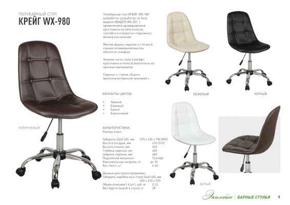 Полубарный стул КРЕЙГ WX-980 разработан с применением крестовины на пяти колесах, газлифта и поворотно-подъемного механизма качания. Мягкие формы сидения и стеганой спинки оптимальной высоты обеспечат комфорт. Сиденье и спинка обтянуты искусственной кожей. Нижняя часть стула (газлифт, крестовина и колеса) выполнены из прочных материалов.