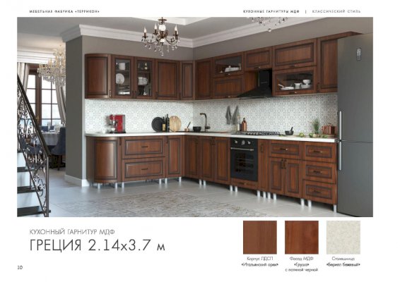 Специально для тех, кто отдает предпочтение классическому дизайну, создана кухня «Греция». Правильные пропорции, отделка естественных цветов и фактур, элегантное декорирование смотрятся беспроигрышно. Из элементов этой модульной системы удается собрать комплект для помещений различной площади и планировки. Готовый гарнитур может быть как угловым, так и прямолинейным.