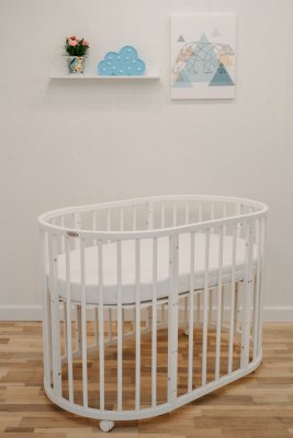 2. Овальная кроватка. Длину кроватки можно корректировать относительно роста ребенка. Это сделает покупку долговечной и избавит от необходимости покупать малышу новую кровать как минимум на пять лет вперед. Размеры овальной кроватки 70*128 см. Для овальной кроватки вы можете приобрести дополнительно овальный матрас.