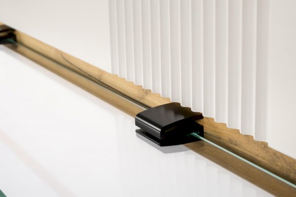 • На вертикальной панели, которая крепится к стене с помощью специальных навесов, закреплена стеклянная полка при помощи туканов.