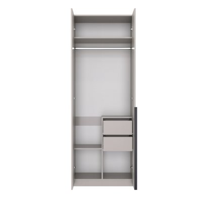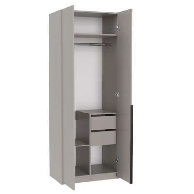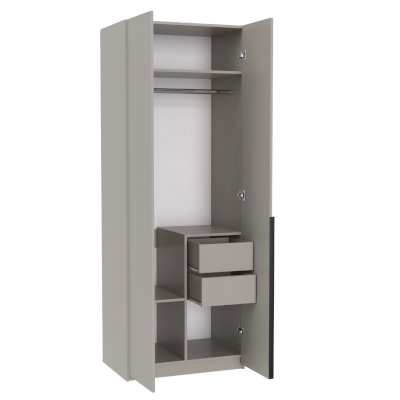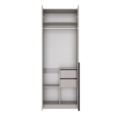 Распашной шкаф имеет 2 дверцы с длинной профильной ручкой. За дверями расположена 1 антресольная полка, платяной отсек с горизонтальной штангой во всю длину, 2 выдвижных ящика и 3 полки / отсека для хранения. Комбинированная модель позволяет использовать её сразу в качестве плательного и бельевого шкафа, где можно разместить гардероб, одежду, белье и другие вещи.