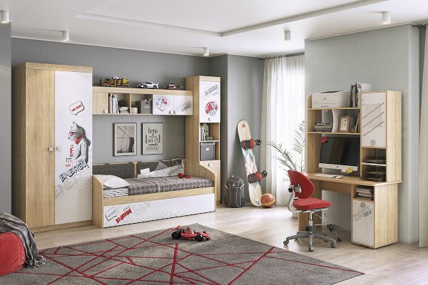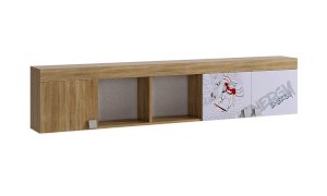 В закрытые шкафы и открытые ниши поместятся все учебники книги и сувениры. Эффектный принтерный рисунок на фасадах выдержан в общем стилистическом решении. Рисунок устойчив к истиранию и ультрафиолету. Можно повесить между шкафов над софой или использовать как самостоятельное изделие.