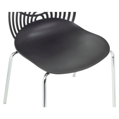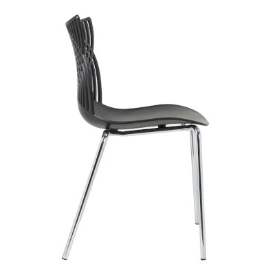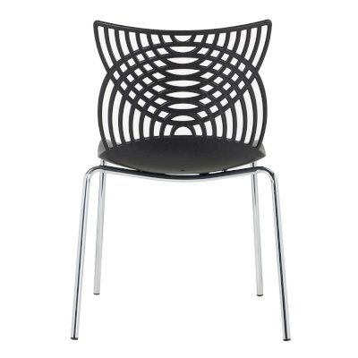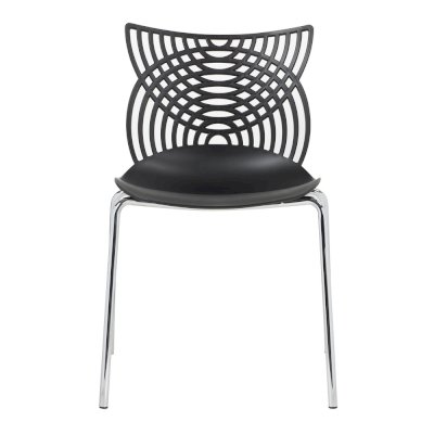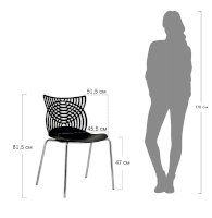 Стул Cat – это ультрасовременная модель мебели для смелых дизайнерских решений. Даже самый простой интерьер превратится в интерьер с обложки модного журнала. Необычная форма спинки в виде кошачьих ушек лежит в основе названия стула. Сидение и спинка стула изготовлены из прочного полипропилена стильного черного цвета, благодаря чему за стулом удобно ухаживать, используя влажную уборку, поэтому изделие отлично подойдет не только для жилого интерьера, но и для оснащения кафе и ресторанов. Хромированные утонченные ножки стула выглядят практически невесомыми, спинка стула имеет замысловатое переплетение, что позволяет сделать интерьер лёгким и не перегруженным деталями.