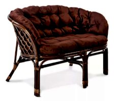 Комплект из натурального ротанга, состоящий из дивана, двух кресел и круглого столика со стеклом.