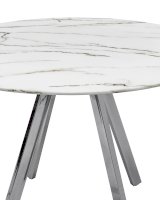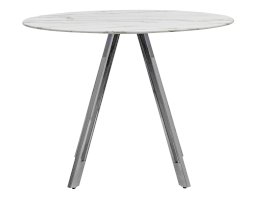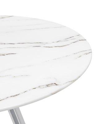 Обеденный стол с красивой стеклянной круглой столешницей белого цвета с рисунком под мрамор. Столешница гармонирует с металлическими ножками оригинальной формы. Такое сочетание смотрится эффектно в любом интерьере.