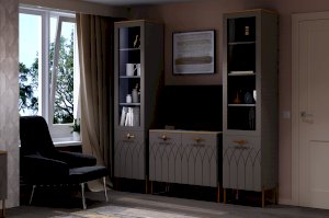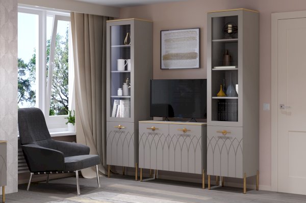 Купить комод в гостиную в современном стиле – практичное решение для вашего дома. Модуль создан не только для хранения, но и несомненно украсит пространство вашей спальни или гостиной. Сочетание мягкого серого оттенка силк анис, яркой золотой фурнитуры и кромки создает неповторимый образ респектабельной мебели.
