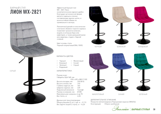 Барный стул ЛИОН WX-2821 со спинкой непременно придется вам по вкусу и создает в кафе неповторимую атмосферу. Основа барного стула ЛИОН WX-2821 - мощная стальная опора, которая крепится к надежному основанию и гарантирует требуемый уровень устойчивости. Сиденье стула изготовлено из экологически чистой гнутоклееной фанеры и обтянуто тканью с применением пенополиуретана различной толщины. Мягкие формы стеганогго сиденья обеспечат посетителю комфорт.
