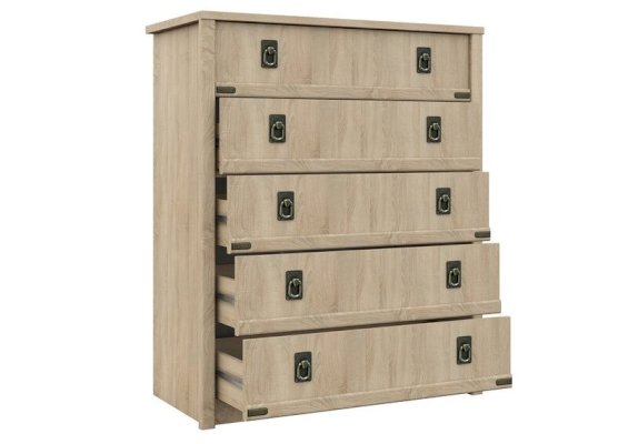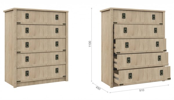 Комод – удобное место для хранения с телескопическими направляющими полного выдвижения. Декоративные накладки и профиль из МДФ по периметру корпуса закрывают острые углы и придают мебели более эффектный и надежной вид. Столешница комода из утолщенной плиты 22мм – надежная и прочная. Мягкая кромка 2мм защищает края модуля от повреждений и сколов. Украшением служат стилизованные металлические ручки MARINE бронзового цвета.
